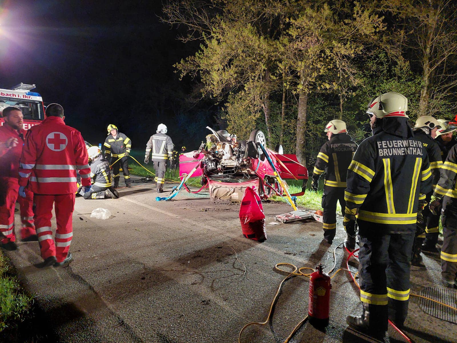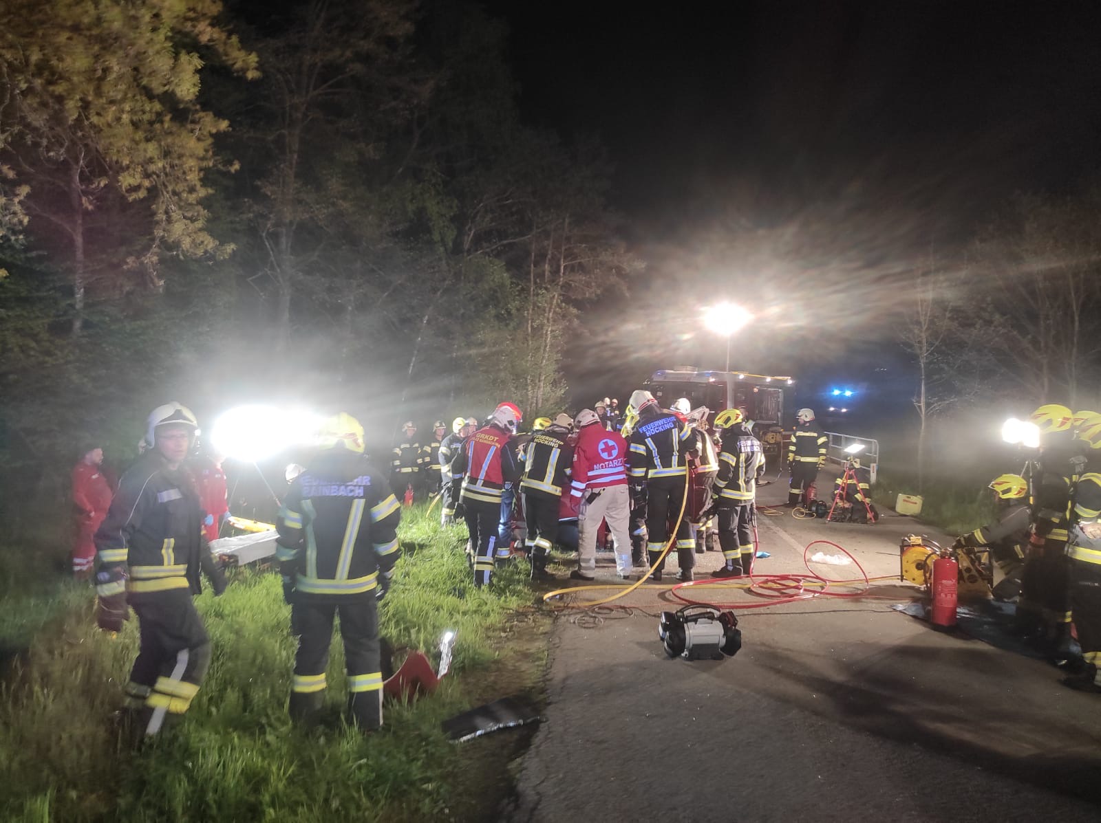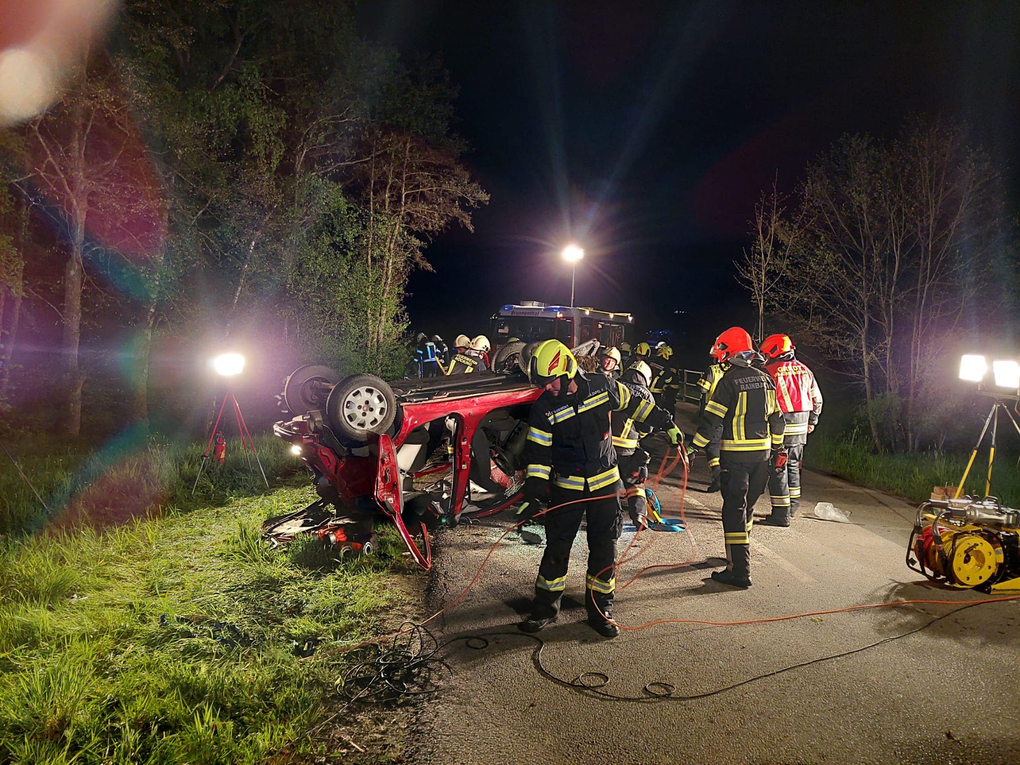 Die FF Rainbach wurde in der Nacht von Sonntag, den 21. April 2024 gemeinsam mit den Feuerwehren Höcking und Brunnenthal zu einem Verkehrsunfall mit eingeklemmter Person alarmiert. Am Einsatzort lag ein schwer deformiertes Fahrzeug auf dem Dach. Aus unbekannten Gründen verlor der Fahrer die Kontrolle über das Fahrzeug, krachte gegen ein Brückengeländer, überschlug sich und blieb auf dem Dach liegen. Eine Person musste mittels Bergegerät aus dem Fahrzeug befreit werden. Nach der Übergabe der verletzten Person an die Rettung wurde das Unfallfahrzeug von der Straße entfernt und die Unfallstelle gesäubert und für den Verkehr wieder frei gegeben.