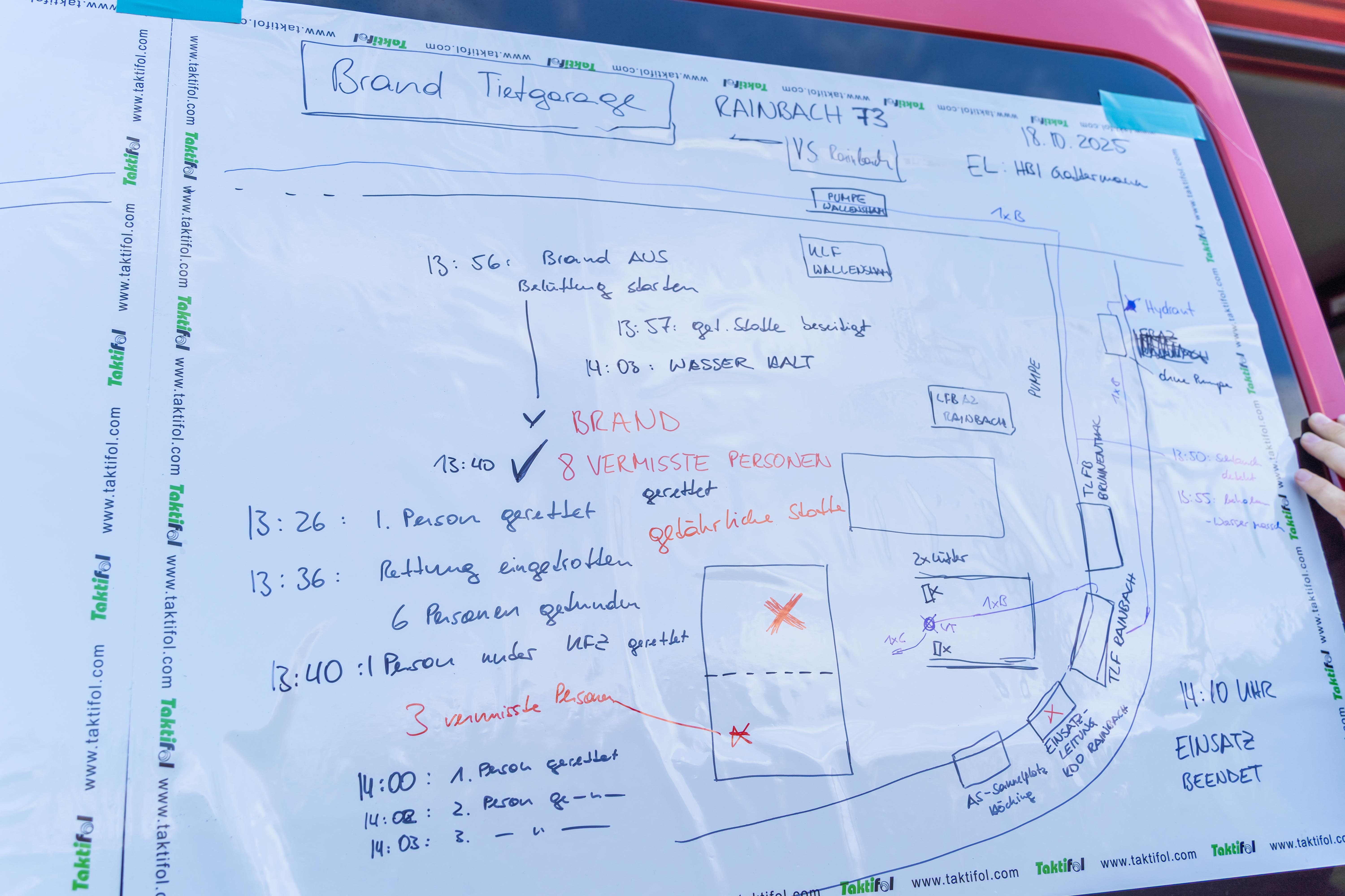 Nachdem Brand-Aus gemeldet wurde, die vermissten Personen gerettet und die gefährlichen Stoffe geborgen wurden, war die Übung für die 75 Einsatzkräfte um 14:10 Uhr beendet. Die anschließende Übungsnachbesprechung fand beim Kirchenwirt Rainbach statt.