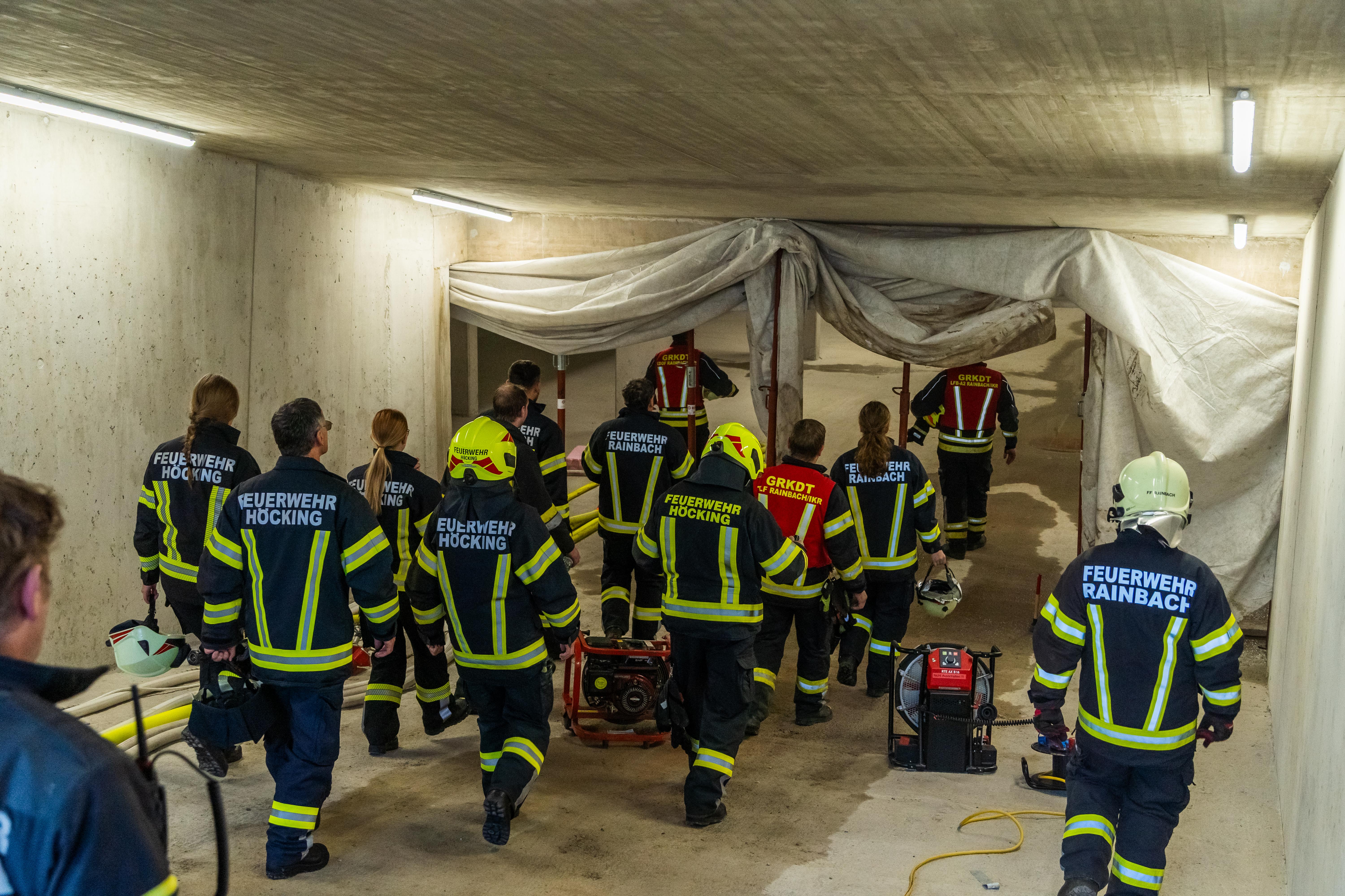 Um 13:05 Uhr wurde die Alarmierung durch Florian LFK alarmiert. Übungsannahme war ein KFZ - Brand in einer Tiefgarage sowie mehrere vermisste Personen und sowie das Vorhandensein gefährliche Stoffe. Feuerwehr Rainbach traf als erste Feuerwehr am Einsatzort ein. Einsatzleiter HBI Josef Gattermann führte umgehend die Lageerkundung durch. Die erste Zubringerleitung wurde vom naheliegenden Hydranten zu TLFA2000 Rainbach gelegt. Der erste Atemschutztrupp Rainbach führte den Innenangriff zur Brandbekämpfung durch. Nachdem der Brand unter Kontrolle war, wurde die Personensuche aufgenommen. Insgesamt waren 5 Atemschutztrupps im Einsatz (2 x Rainbach, 1 x je Wallensham, Brunnenthal und Höcking). Zur Sicherstellung der Löschwasserversorgung wurde eine Zubringerleitung vom Freibad Rainbach zu TLFB Brunnenthal über eine Strecke von 600m gelegt.